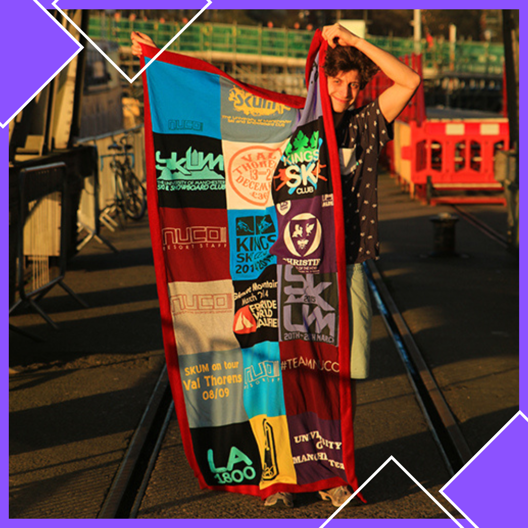 "Absolutely love my blanket! I chose a 16" throw, which is perfect for snuggling on the sofa. All my Uni Ski Club t-shirts were just lying around, but I was too attached to them to throw away – this was the perfect solution!"